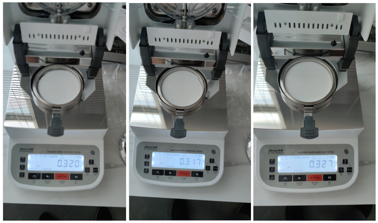 - 复位仪器,待仪器冷却至40℃以下后,再取4g样品铺在样品盘上,重复上述测试步骤;测试结束后得出第三组数据,显示样品的水分含量为0.327%;数据基本相同,排除了一、二组测试的小概率巧合,确认测定结果准确。