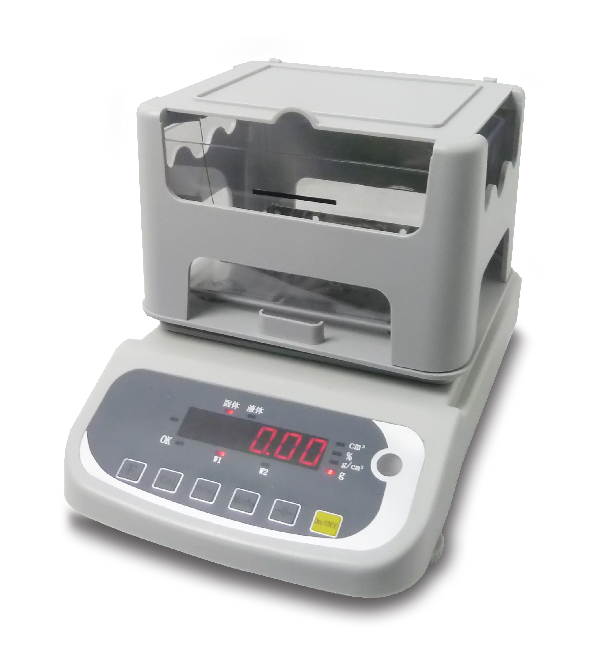 - 将密度计通电,在水槽中装入水至刻线处,放在主机上,再将称量台装上;