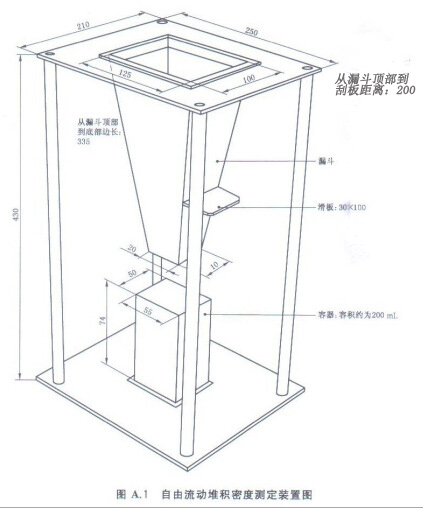 原理:自由流动堆积密度把样品通过一个特定的漏斗注入到一个特定的已知体积和质量的容器中,称量容器的内容物的质量