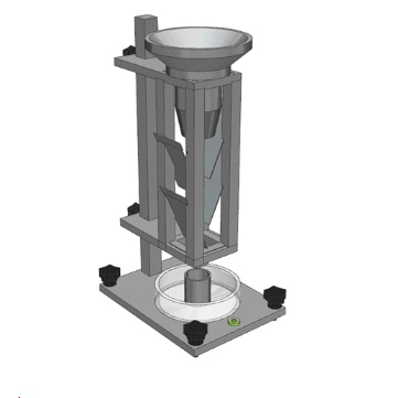 粉末放入上部组合漏斗中的筛网上,自然或靠外力流入布料箱,交替经过布料箱中的四块倾斜角为25°的玻璃板和方形漏斗,最后流入已知体积的圆柱杯中,呈松散状态。然后称量圆柱杯中的粉末的质量。