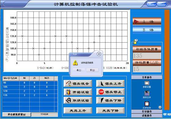 试验开始时,首先选择试验方法,估计一个初始质量和Δm值,进行试验,如果第一个试样破损,用砝码Δm减少落体质量;如果第一个试样不破,须用砝码Δm增加落体质量依此进行试验。总之,利用砝码减少或增加落体质量,取决于前一个试样是否破损。20个试样试验后,计算破损总数N,如果N等于10,试验完成;如果N小于10,补充试样后,继续试验直到N等于10;如果N大于10,补充试样后,继续试验直到不破损的总数等于10为止,最后由系统自动计算冲击结果。