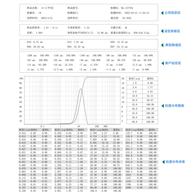 显示模板粒径区间求百分比,以满足不同行业对粒度测试的表征方式。径距、一致性、区间累积等等