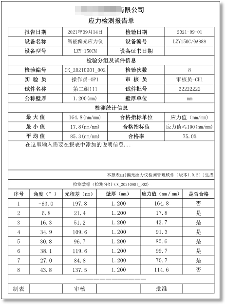 - 检测报告输出:使用“PDF”格式或“XPS”格式文件输出不可更改的检测报告,检测报告中包含公司信息、检测信息、设备信息、样品信息、批次的最大值、最小值、平均值和合格率。