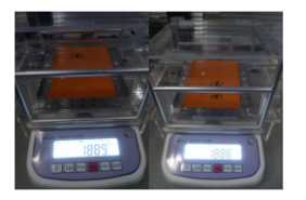 - 将塑料板材(样品1)放在架子上面显示空气中的重量138.80g,然后按mode键记录下重量,再将塑料板材放入水中显示水中重量65.47g,按下mode键记录下重量。显示密度值1.889g/cm3。