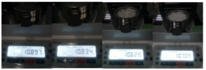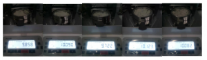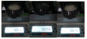 - 将防风盘、支架、样品盘一一装好,接通电源,按下开机键,显示屏进入开机界面,首先按去皮键减去样品盘重量,后将100g砝码放入托盘进行校准;