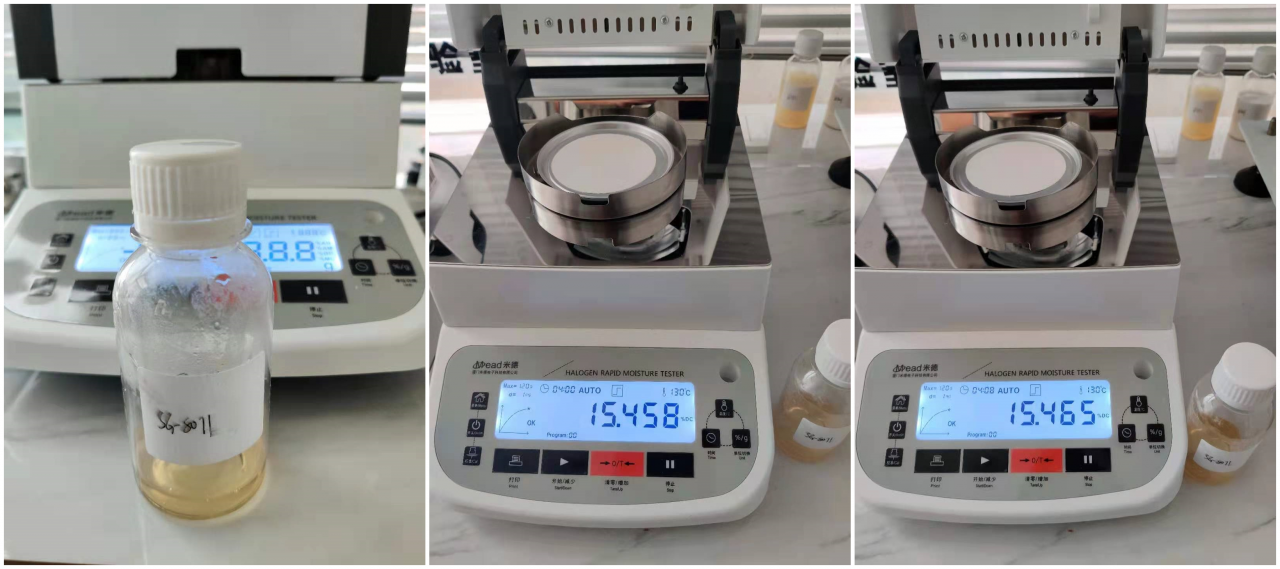 7、重复上述步骤,继续测试溶液3,测得溶液3两次测试的固含量结果为15.458%和15.465%,误差为0.007%。