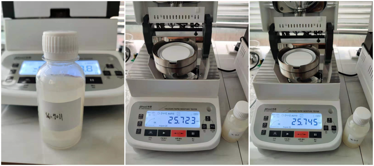 6、做完溶液1的重复性测试后,我们对溶液2进行同样的操作,重复上述步骤,得出溶液2两次测试的固含量结果为25.723%和25.745%,误差为0.022%。